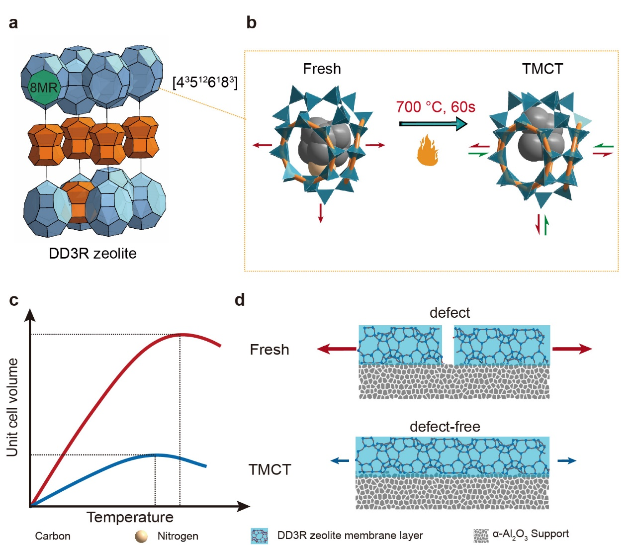 鉴于此,课题组提出一种脱膜板剂策略,即通过快速升温、瞬时热解,调控DD3R分子筛骨架柔性,再在550℃下连续煅烧脱除模板剂,获得无缺陷DD3R分子筛膜,远超现有同类分离膜的性能水平。